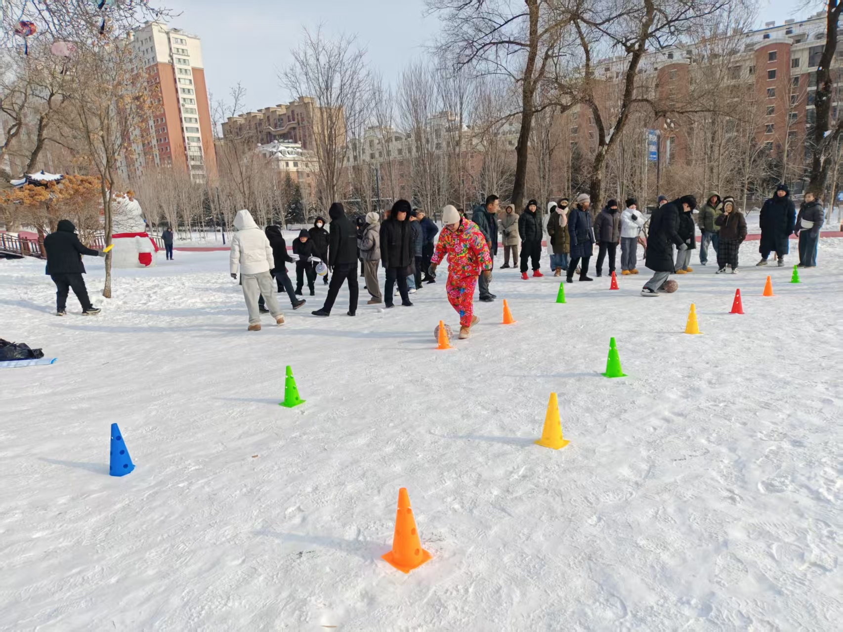 飞盘投掷项目率先开始。参赛者们手持色彩鲜艳的飞盘,专注地瞄准远处的目标区,飞盘在空中划出一道道优美的弧线,赢得阵阵掌声。带球过杆项目尤其考验选手的控球能力和身体协调性,残疾人选手们专注地操控着脚下的足球,每一次顺利通关都彰显着坚韧与毅力。雪地拔河比赛将运动会推向高潮。哨声响起,双方队员立刻铆足了劲儿,绳子在雪地上被拉得笔直,加油声此起彼伏,难分胜负。