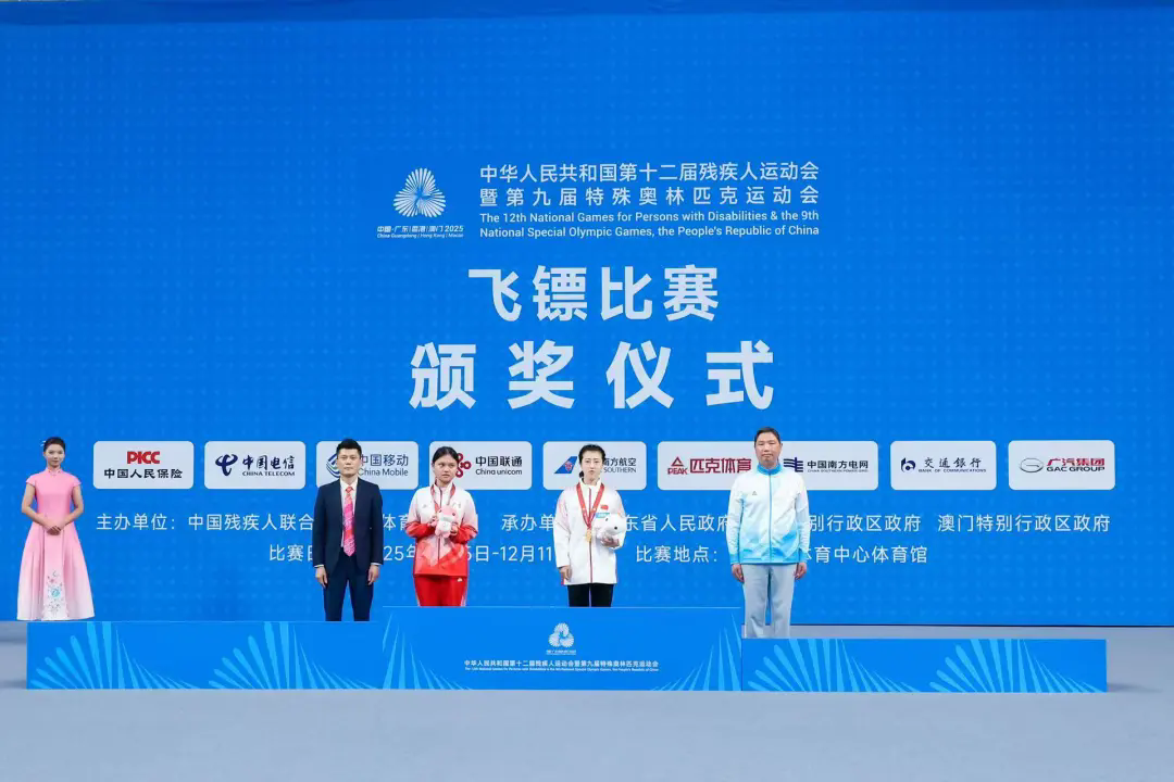 飞镖智力残疾组女子单人赛颁奖现场 盛楠(右二)夺冠