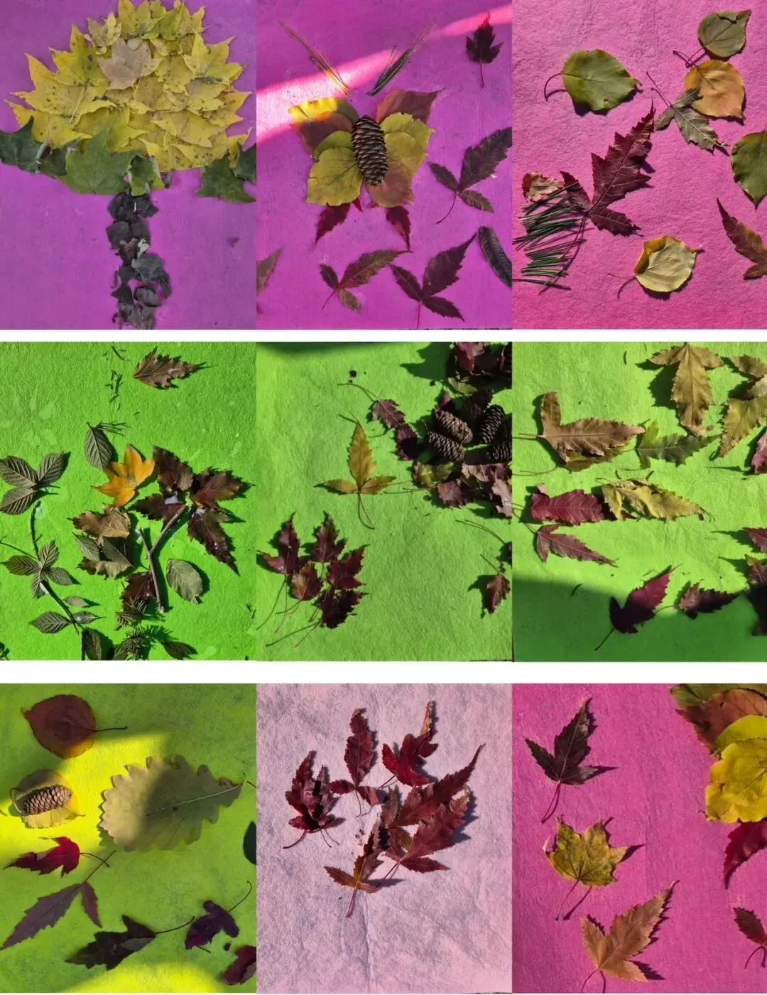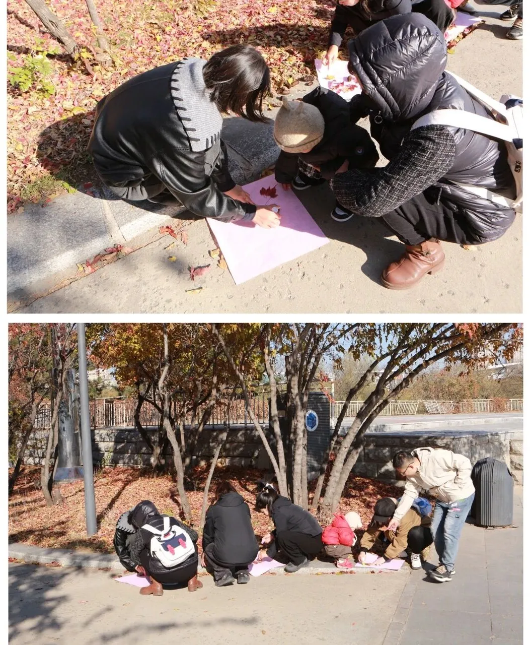活动在温暖的秋日阳光中拉开帷幕。“秋日寻踪”让孩子们融入金色的童话世界。在教师和家长的引导下,孩子们沿着园路漫步,睁大了好奇的双眼,观察树叶多彩的颜色,俯身捡拾一片片形态各异的落叶和松果“看,这是红色的叶子!”“这个是黄色的,像小扇子!”“这片叶子是锯齿状的,好特别呀!”丰富的词汇在真实的语境中自然涌现,观察力、动手能力与语言表达能力在欢声笑语中得到锻炼。在采集树叶的过程中,孩子们也看到了各种各样的雕塑,他们的创造力和想象力也被充分激发,就像一群灵动的精灵,在艺术的海洋中尽情遨游,收获着成长得快乐与惊喜。