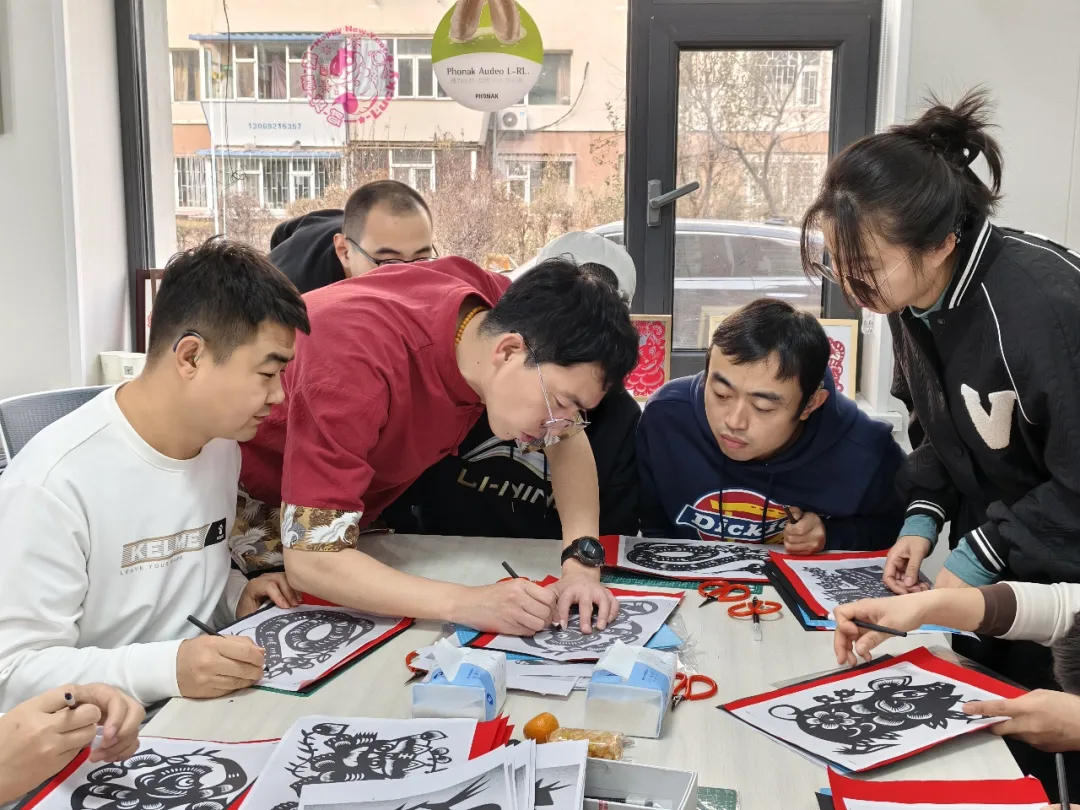 剪纸桌前,专业剪纸老师耐心示范着折叠、裁剪的技巧,从简单的窗花轮廓到精巧的花鸟图案,大家在相互请教中逐渐配合默契。红纸在指尖翻飞,一个个寓意吉祥的剪纸作品逐渐成型,不仅展现了大家的创造力,更成为彼此情感联结的纽带。