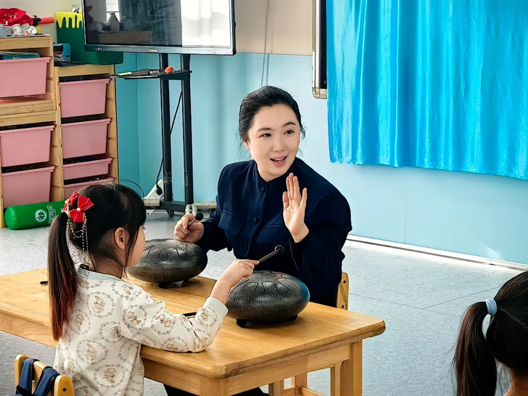 空灵鼓教学体验环节,悠扬悦耳、纯净空灵的鼓声深深吸引了孩子们。康复教师带领孩子们感受声音的美妙,学习简单的敲击节奏,让孩子们在聆听与演奏中,真切体会聆听世界的美好,进一步激发爱护听力的意识。