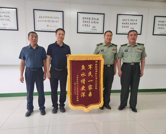 在建军节前夕,吉林省残疾人中等职业学校党支部书记等一行带着全校师生的心意,来到联勤保障部队第九六四医院。一面写有“军民一家亲 鱼水情更深”的鲜红锦旗被郑重交到医护人员手中,感谢医院对师生的持续关怀与帮助。