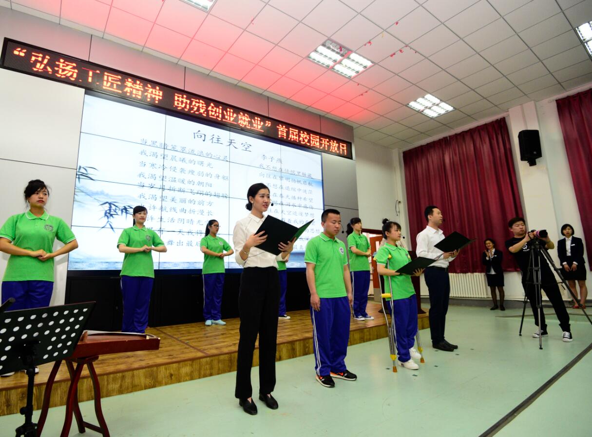 专业课及实训课展演区:针对不同专业、不同残疾类别学生的生理和心理特点,分别展示了不同的教学科目、教学场景和实训项目,充分体现了我校特殊教育的特点。其中车牌打印实训项目,是教学与实践的紧密结合,学生们特别感兴趣,实用性强,学生的作品也最受嘉宾喜爱。