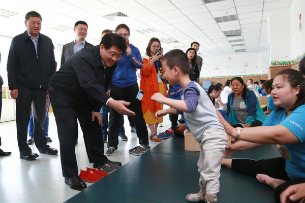 在省残疾人康复中心一楼大厅,大家参观了由省残联、省卫计委联合开展的吉林省残疾预防和残疾人康复工作成果展览。讲解员向大家系统介绍了近年来全省在推进残疾预防和残疾人康复工作所取得的成果,并一一介绍了各市州、省残疾人康复中心、省聋儿康复中心的残疾人特殊康复工作。在三楼脑瘫儿童康复区,隋忠诚副省长亲切看望了在这里康复训练的脑瘫儿童,鼓励孩子们努力锻炼,早日康复,并为他们送来可爱的小礼物,提前祝小朋友们六一儿童节快乐。在四楼成人康复区,省政府残工委相关成员单位的领导与在这里进行康复治疗的残疾人朋友进行交流。隋忠诚副省长代表省委、省政府,对全省193万残疾人朋友,还有残疾人朋友的亲属致以节日的问候,对多年来关心支持残疾人事业发展的社会各个方面表示感谢,对工作在第一线的广大残疾人工作者致以亲切的慰问。