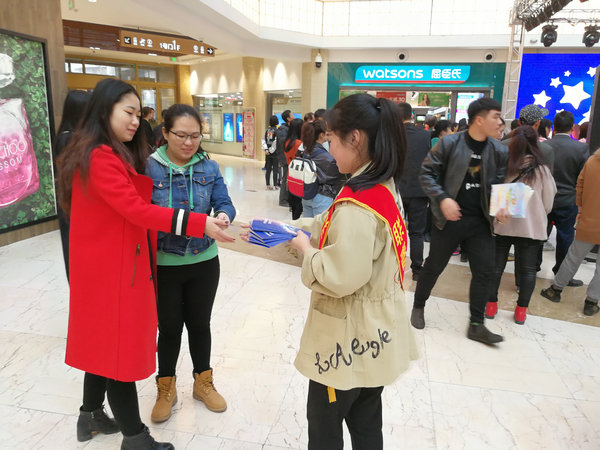 图为志愿者向市民发放宣传折页