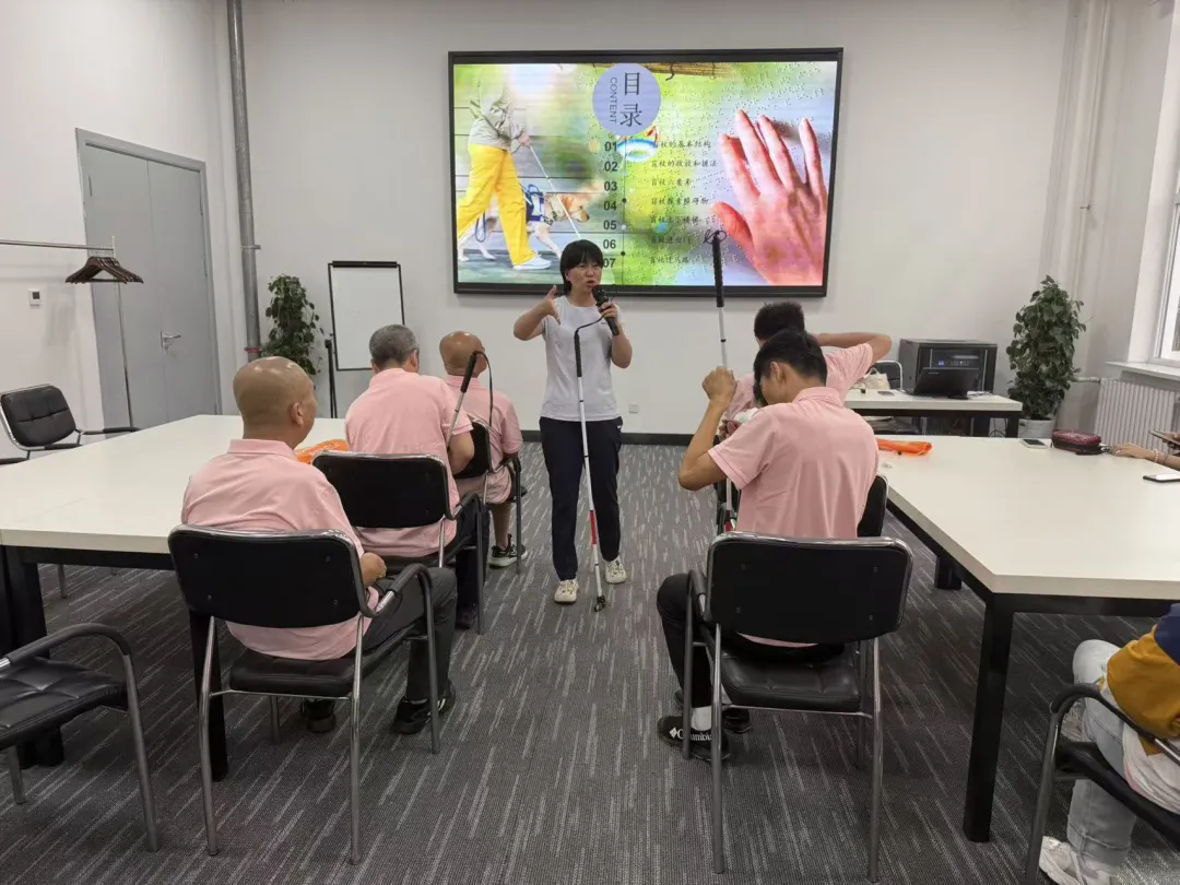 另一边,视障伙伴专属培训组则围绕盲杖使用方法展开细致教学。从“手腕发力触地”的基础动作练起,通过模拟常见场景,让学员在反复练习中掌握核心能力。