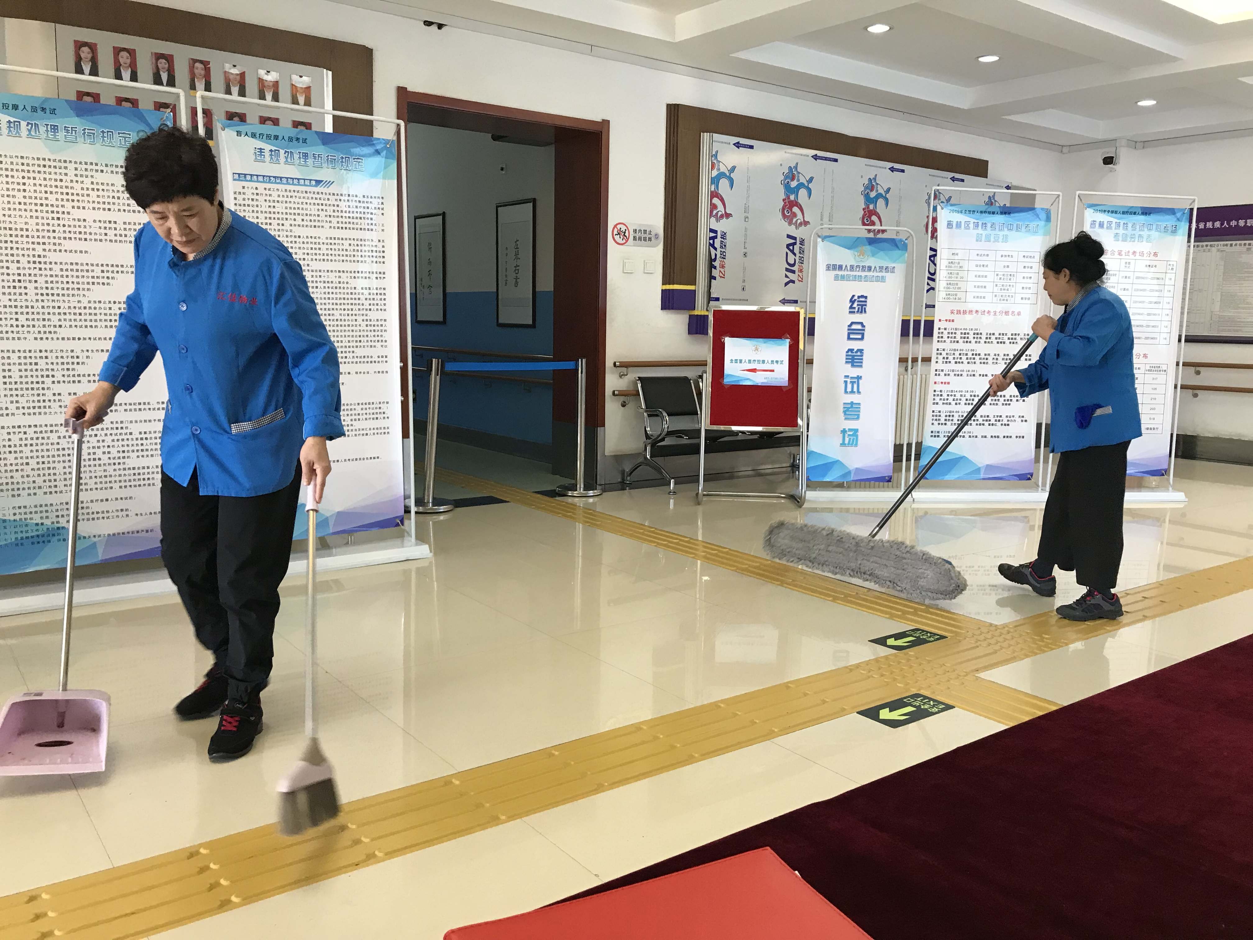 保洁阿姨跟踪清理地面,防止考生滑倒;后勤检修灯管;网管广播调试、网络维护;摄影师摄录珍贵的瞬间;公安干警巡逻待命,每个人的努力无一不是为了让考生有个良好的考试环境。