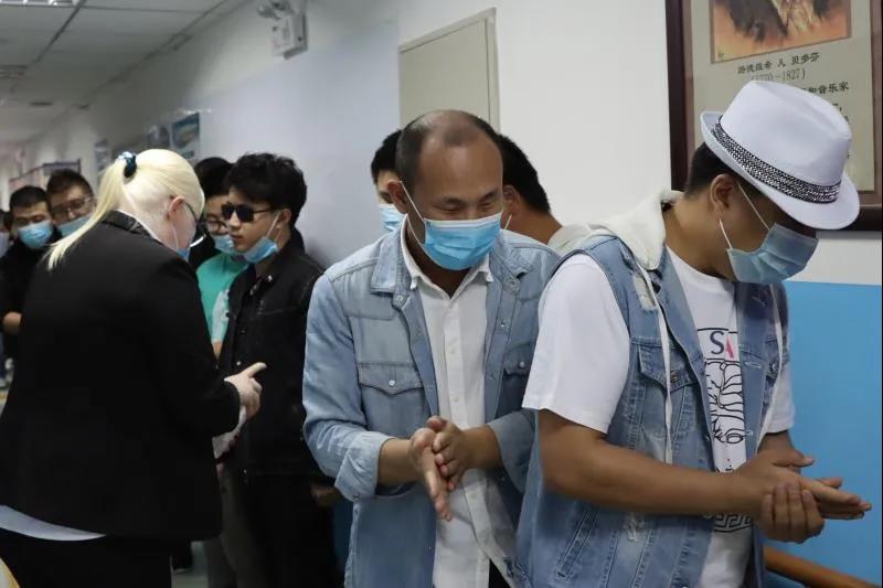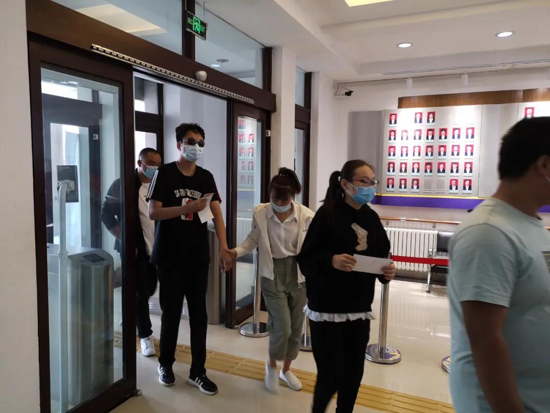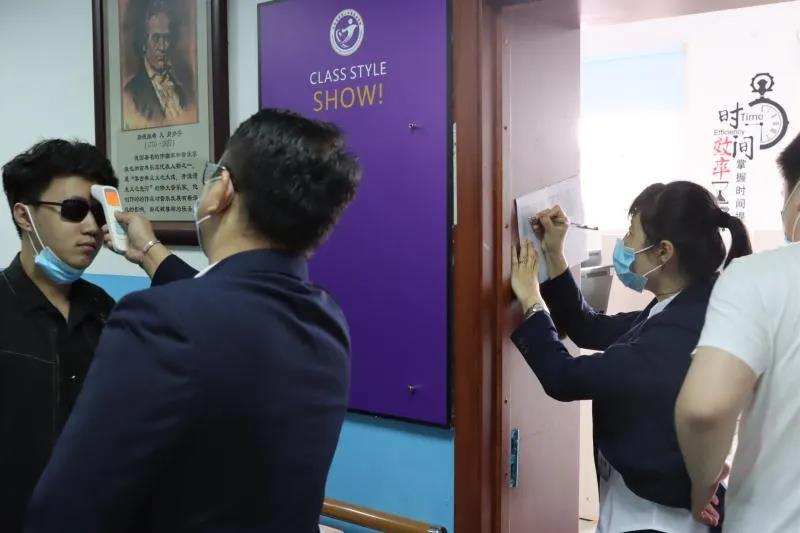 8时30分,引导员带领我们以倒叙的方式开始入场,我们手扶引导员的肩膀,一位挨着一位,并进行消毒与体温监测,晨检是在疫情下确保我们每天安全学习需要经历的第一步。