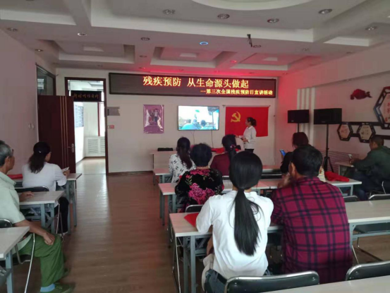 图为石人镇专职委员在为大家播放残疾预防宣传片